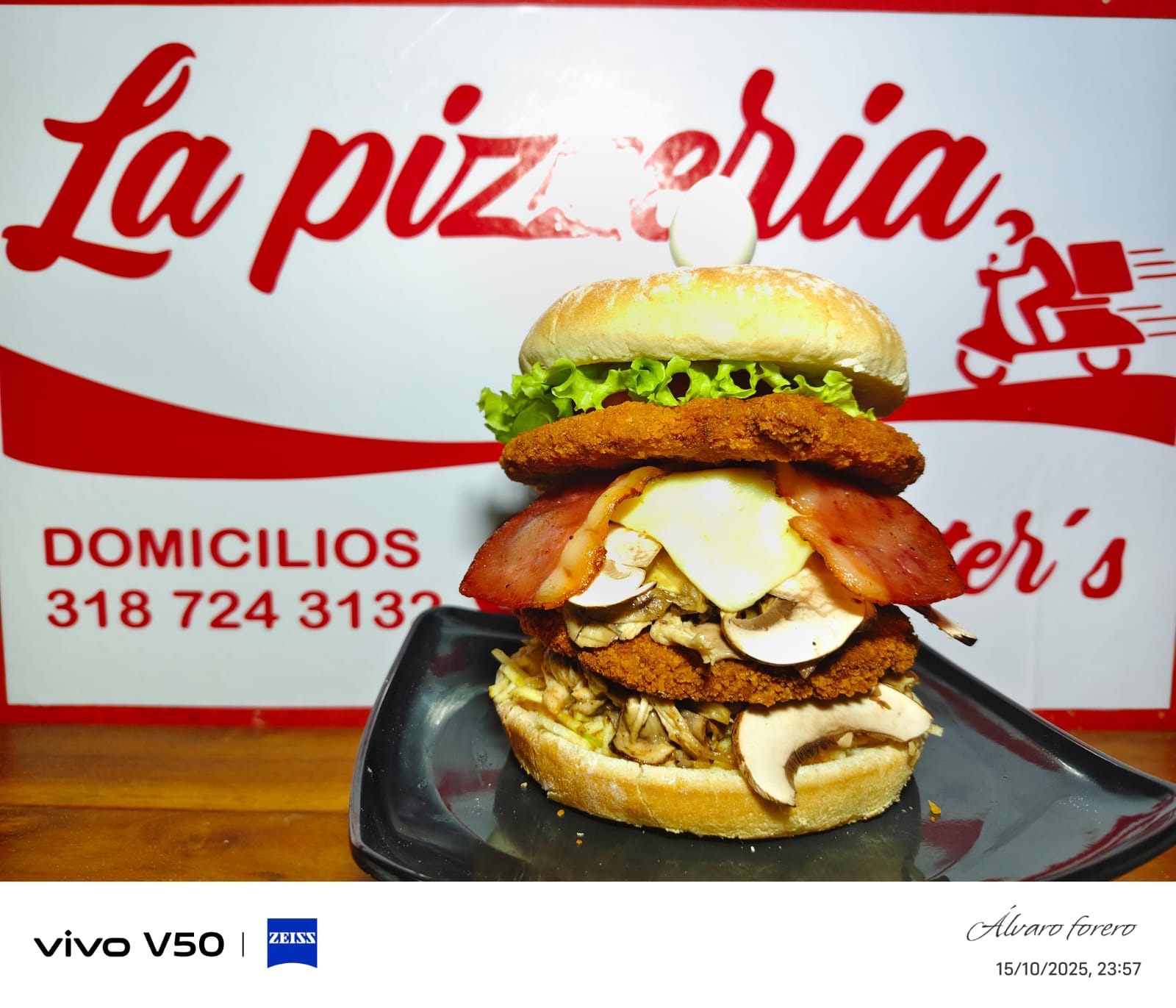 / DOBLE MASTER SUPER COMBO Doble carne, tomate, cebolla caramelizada, lechuga, tocineta, pollo, champiñón, queso, huevo de codorniz, papa chips, salsas