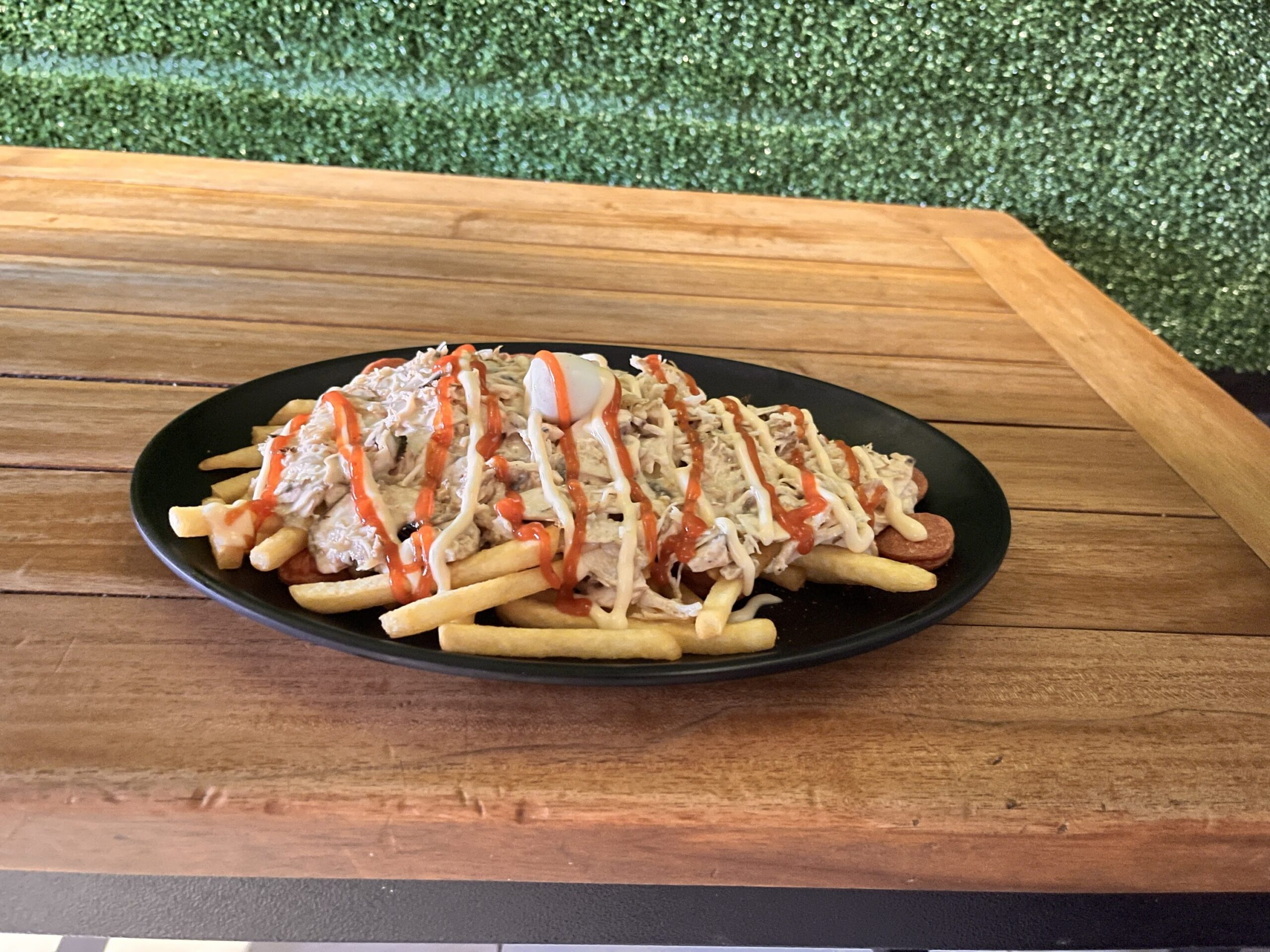 ESPECIAL Papas a la francesa, salchicha americana, huevo de codorniz, pollo, champiñón, queso, salsas