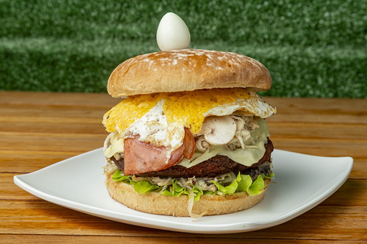 / SUPER MASTER ESPECIAL Carne, tomate, cebolla caramelizada, lechuga, tocineta, pollo, champiñón, doble queso, huevo frito, huevo de codorniz, papa chips, salsas