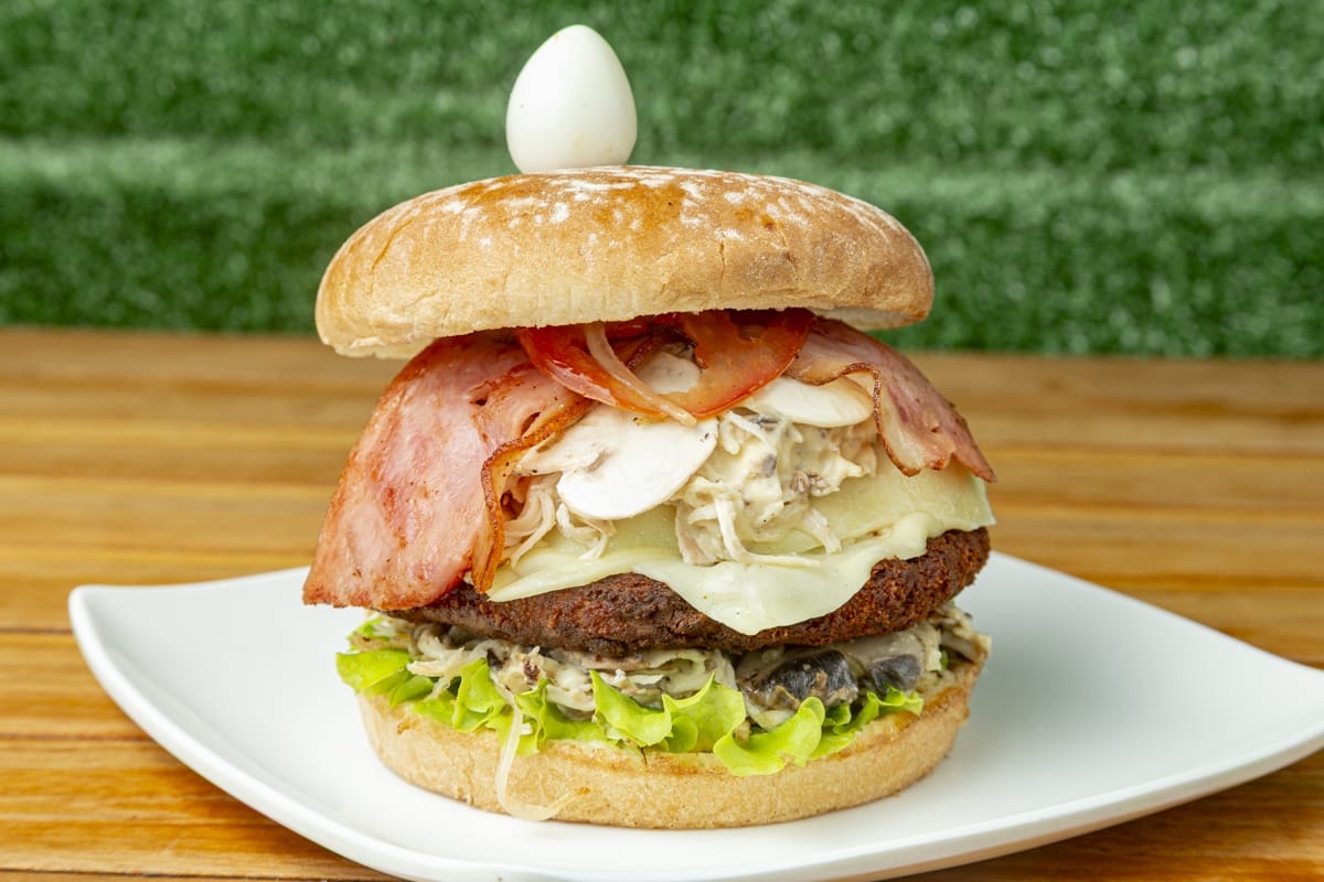 SUPER MASTER Carne, tomate, cebolla caramelizada, lechuga, tocineta, pollo, champiñón, queso, huevo de codorniz, papa chips, salsas