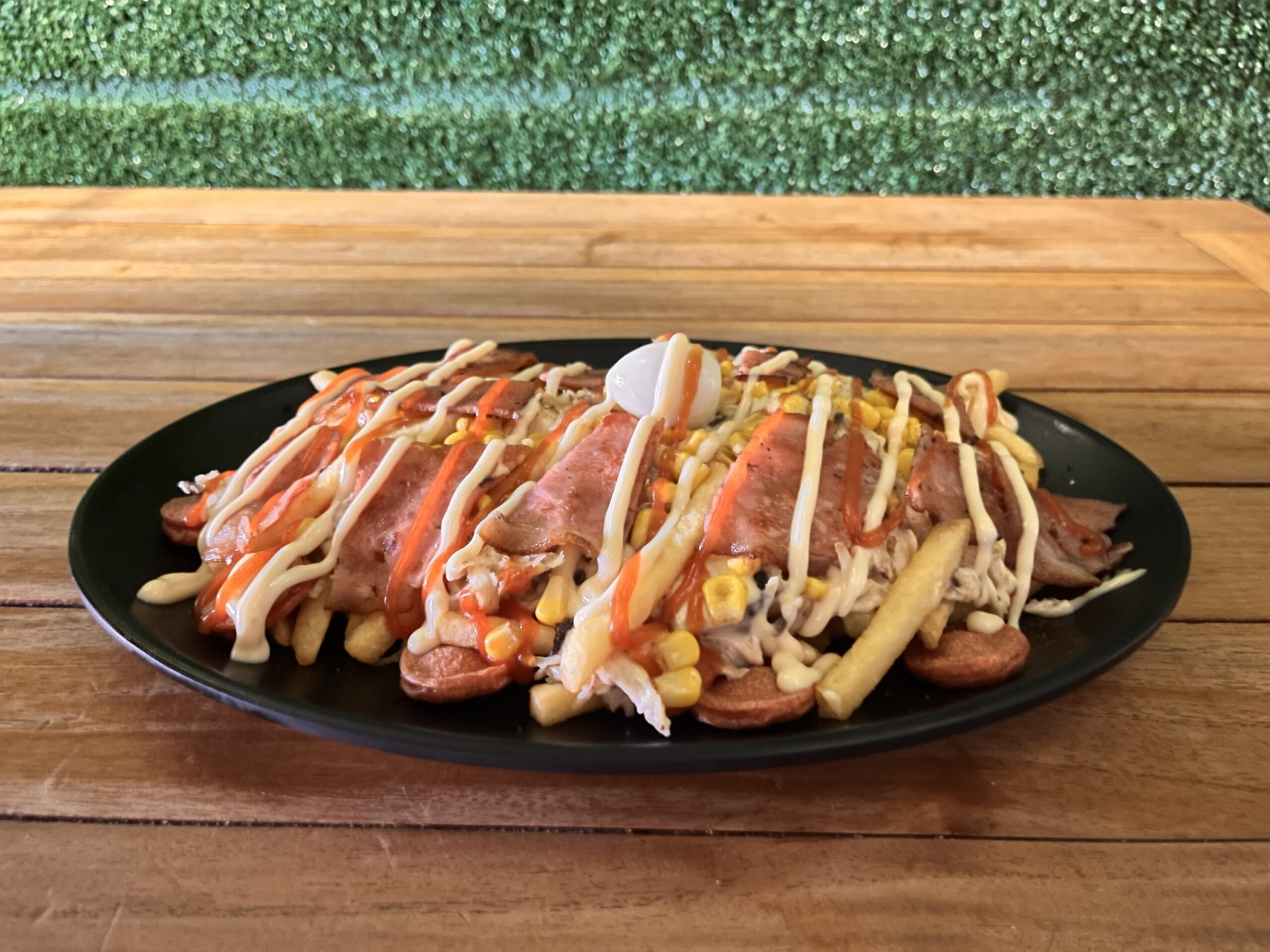 SALCHIPAPA MASTER Papas a la francesa, salchicha americana, maíz, pollo, champiñón, tocineta, queso, salsas